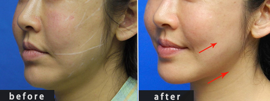 手術前後的對比能夠明顯的看出,嘴角的角度,已被拉提至上揚的位置,臉頰的蘋果肌也因為肌膚緊實而浮現,原本於下顎輪廓凸出的嘴邊肉也撫平均勻。