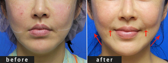 手術前後的對比能夠明顯的看出,嘴角的角度,已被拉提至上揚的位置,臉頰的蘋果肌也因為肌膚緊實而浮現,原本於下顎輪廓凸出的嘴邊肉也撫平均勻。