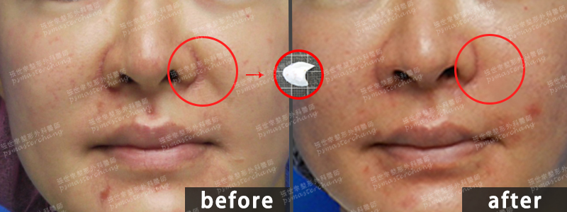 從案例的前後對比來看,執行鼻溝槽凹陷手術後,本來延伸出現的法令紋,也隨之消失,從鼻翼到嘴角位置都顯得更加飽滿。